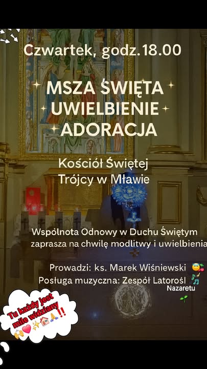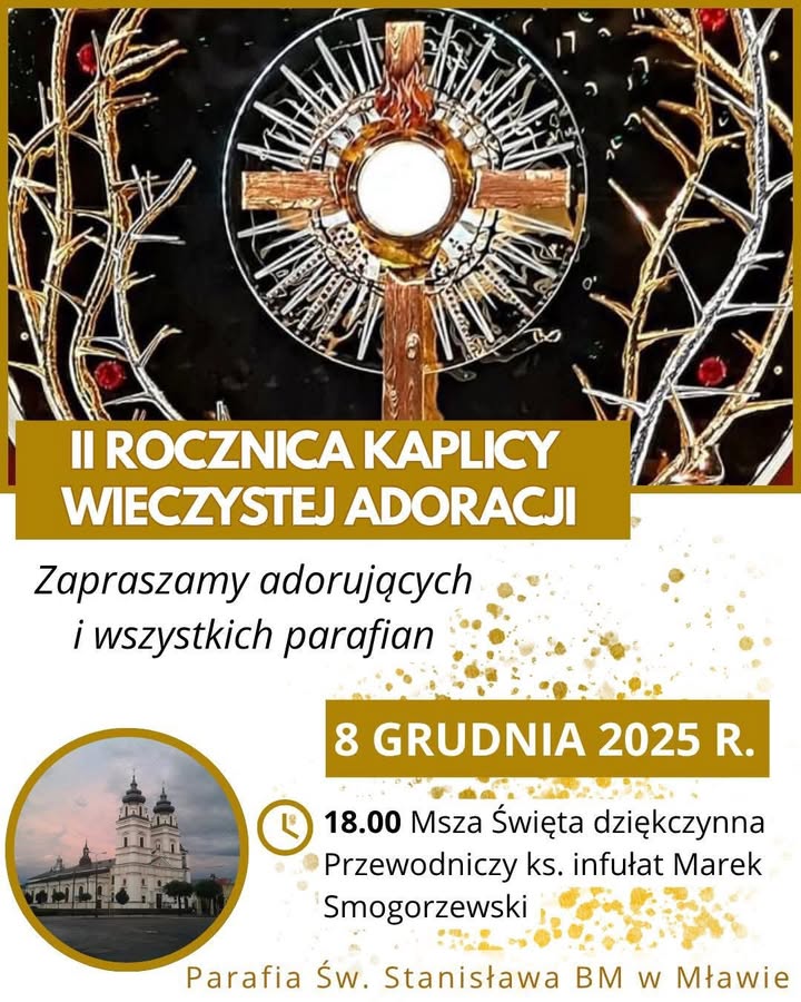 8 grudnia (w poniedziałek) na wieczornej Mszy będziemy świętować Drugą Rocznicę Powstania Kaplicy Wieczystej Adoracji w Mławie🔥 Pomogą nam w tym: 🙏🏼 ks. infułat Marek