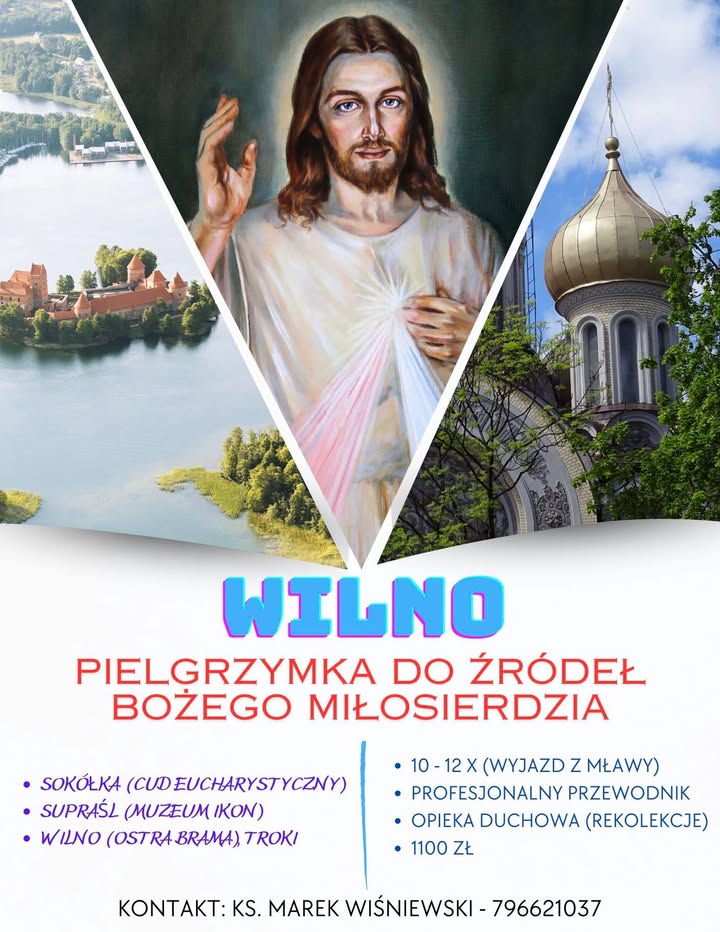 Zapraszamy na weekendową pielgrzymkę na Litwę pod hasłem „Do źródeł Miłosierdzia”. Termin: 10-12 października, koszt 1100 zł. W programie: Sokółka (Msza święta w miejscu Cudu
