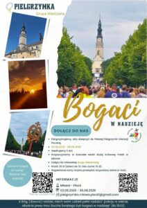 Na prośbę ks. Jacka Marciniaka przekazujemy informację (i zachętę) dotyczącą możliwości zorganizowanego pielgrzymowania pieszego z Mławy do Płocka. Pielgrzymka wyruszy 3 sierpnia z Parafii Matki Bożej Królowej Polski w Mławie po Mszy św. o godz. 7.00. Od godziny 6.00 do 6. 50 będzie można oddać bagaż na parkingu przed kościołem. Oczywiście zachęcamy do kontynuowania pielgrzymowania z Płocka na Jasną Górę. Więcej informacji na stronie Facebooka „Grupa Miedziana – Płocka Piesza Pielgrzymka na Jasną Górę” lub na plakacie.