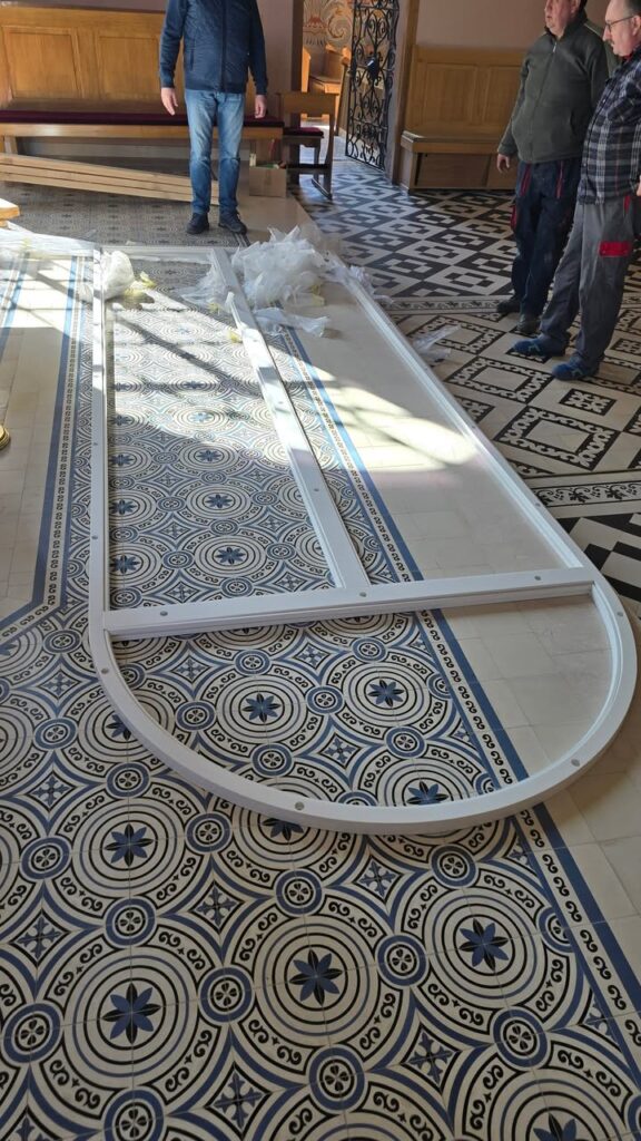 W naszym kościele następuje kolejny etap prac. Montowane są ramy w które wstawiane będą kwatery witraży. Piękne dzieło stolarskie z modrzewia syberyjskiego. W południowym oknie prezbiterium witraż bedzie przedstawiał prawdę wiary „Zmartwychwstał trzeciego dnia”. Witraż będzie zamontowany jeszcze przed Wielkanocą.